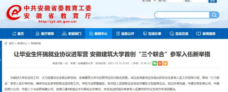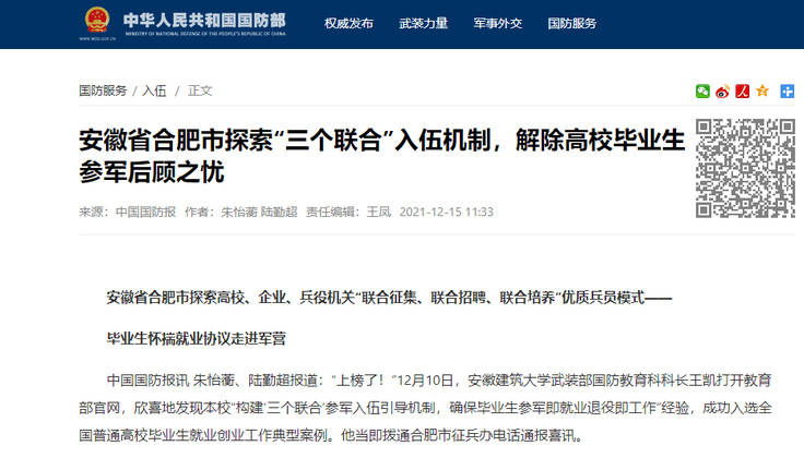 编者按: 12月15日,《中国国防报》头版刊发《安徽省合肥市探索高校、企业、兵役机关“联合征集、联合招聘、联合培养”优质兵员模式--毕业生怀揣就业协议走进军营》,详细报道我校以“三个联合”助推征兵工作模式。中国国防部网站、安徽教育网同步进行转载推介。