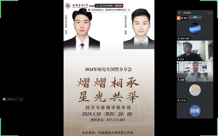 熠熠相承,星光共举。近日,研工部在线上开展2024年第2期国奖经验交流分享会。本期讲座邀请了我校经济与管理学院两位获得国家奖学金的研究生分享国奖经验。