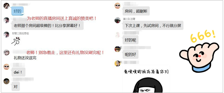 功夫不负有心人,在老师和同学们的协调配合下,网课正如火如荼的进行着。尽管一切渐入佳境,但前期由于平台拥堵与操作不熟等问题,还是闹出了很多可爱又美好的“翻车”瞬间:当同学们还在紧张又兴奋的准备与主播连麦时,却发现“网络主播”早已不在直播间,被迫下线,上着上着老师不见了,有点慌;上课时不知是哪位熊孩子没关麦,屏幕的那端竟传来“是谁在唱歌、温暖了寂寞…”的美妙歌声,弄得大家啼笑皆非;老师课间休息时忘记闭麦,用淳朴的方言与家人讲话,很多同学听到浓浓的乡音倍感亲切,也因此拉近了与老师的距离;同学们也在直播间与老师积极地互动,送礼物、刷小花、飘红心…一切的美好瞬间都丰富着同学们线上课堂的体验,让大家的课堂妙趣横生、多姿多彩。