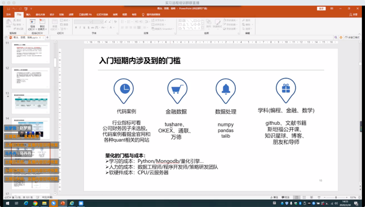 鉴于经济学专业设立有投资经济方向且未来可能面向金融行业就业,拟定本次培训课程为“金融实务岗位培训系列课程”,具体涉及商业银行信贷风险管理、投资顾问、证券/基金公司研究、金融数据分析师等金融行业从业岗位。针对以上岗位,深圳市天择教育科技有限公司邀请长期在金融行业从业的戴寒永、毛年、吴欣婷三位资深高管担任培训讲师,开展线上专业实习培训。
