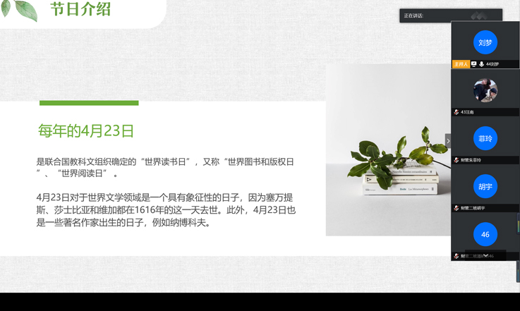 活动首先为大家介绍了世界读书日的来源、目的及意义,并向大家普及了世界各地庆祝读书日的方式,使同学们加深对世界读书日的了解与体会。其次,活动向大家介绍了读书的意义以及优秀书籍作品和作家,希望鼓励大家能够养成终身阅读的好习惯,尊重和感谢为人类文化文明做出过巨大贡献的文学大师们。