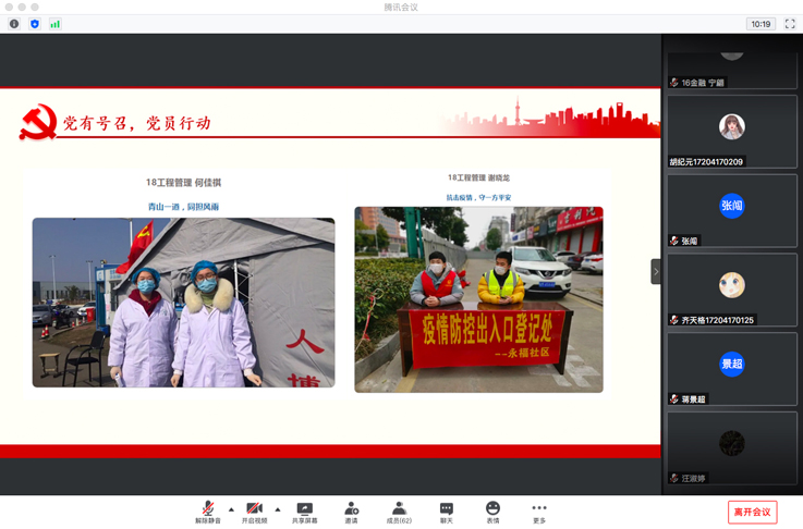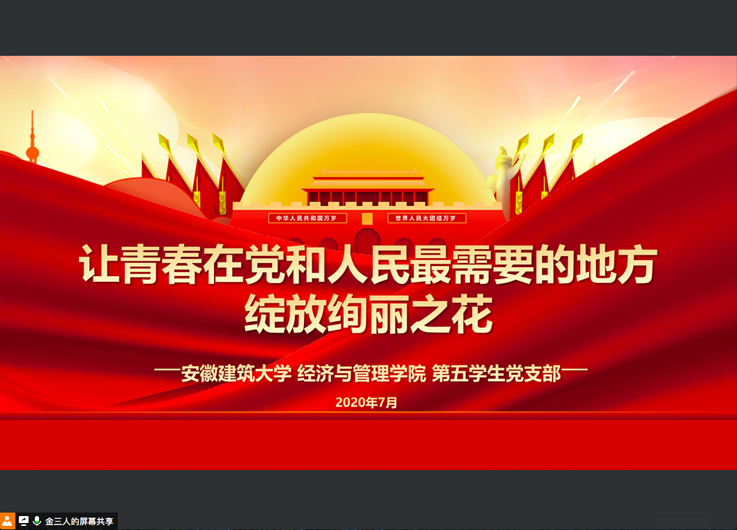 本网讯  为庆祝党的生日,落实常态化疫情防控“四个一”行动,引导学生党员明确责任、永葆初心,经管学院第五学生党支部于7月8日举办主题为“让青春在党和人民最需要的地方绽放绚丽之花”线上微党课。