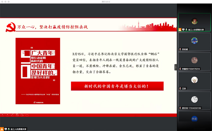 随后支部书记结合《中国有故事——致敬青年志愿者》专题记录片、疫情期间涌现的感人事迹及经管学子在疫情期间贡献青春力量等内容,引导全体党员同学不忘初心、牢记使命,在祖国需要的时候挺身而出,用自己稚嫩的肩膀,扛起时代赋予的重任。