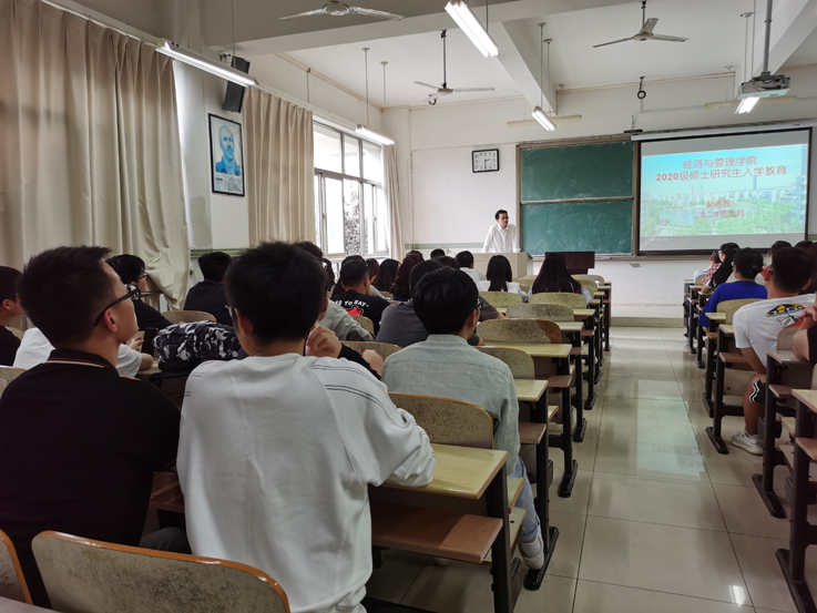 彭志胜向2020级硕士研究生介绍了经管学院的学位点设置、招生录取、学位点的定位、特色和优势等情况;重点围绕学术规范、学术不端行为认定、研究生培养方案、奖学金评定和毕业要求等学生关心的政策规定进行详细解读。他对各位研究生寄予几点厚望:一是坚持疫情防控意识不放松,树立大局意识;二是尽快转变角色,适应新的学习环境,早日成才成长;三是恪守学术道德规范要求,遵纪守法;四是多读好文献,积极参加研讨交流,提高学术素养;五是多与导师见面,主动接受指导,在导师指导下早确定课题方向、早开展研究工作;六是高标准、严要求,多出高水平研究成果。
