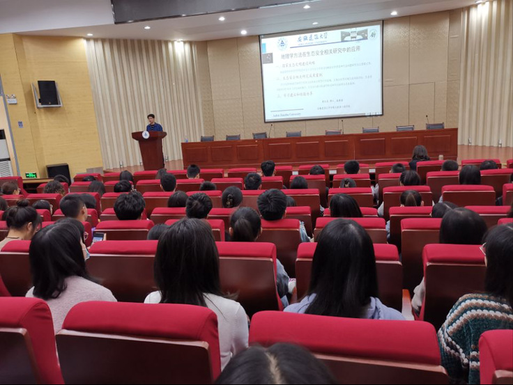 黄木易以“地理学方法在生态安全相关研究中的应用”为题,从国家生态文明建设战略目标视角,结合区域生态风险评估、生态服务价值测算和生态安全格局构建相关研究案例,阐述我国新时代生态文明建设研究的主要内容和生态问题研究的主要模式,介绍地理学相关模型和技术方法的具体应用,并分享其本人的相关研究成果和经验。