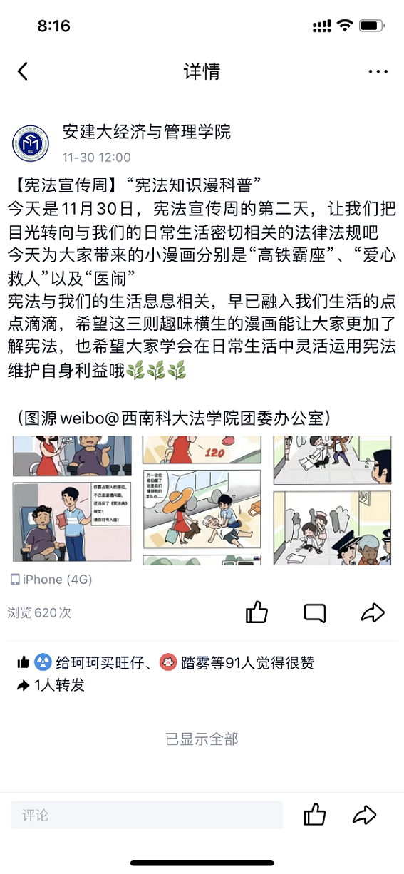 同时,学院通过官方QQ平台进行了“宪法知识漫科普”宣传活动,每天的宪法科普漫画潜移默化,让同学们对宪法与生活的联系有了更多的思考与认识。