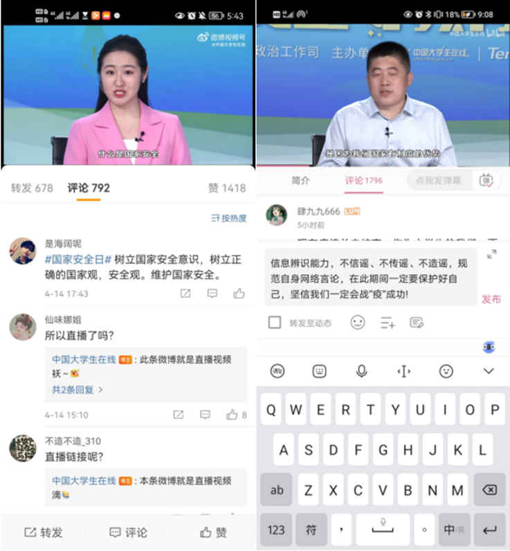 为与线下的主题活动相结合,达到更好的宣传教育效果,学院组织了丰富多彩的线上活动。同学们通过VR全景沉浸式游览、“微博#国家安全日#话题”互动、国家安全日专项答题活动,引导同学们深刻认识当前我国的安全形势,增强同学们自觉保护国家安全、保守国家秘密的动力,使同学们对《国家安全法》《生物安全法》《网络安全法》《国家情报法》《反恐怖法》《保密法》等安全知识有了更深入的了解。