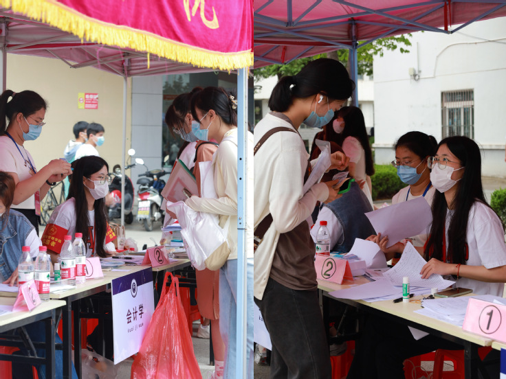 图书馆门口,新生报到点和新生报到须知的指示牌都立在最显眼处,鲜艳的迎新标语和志愿者们的红袖章交辉相映,随处可见工作人员忙碌的身影。在志愿者的引导下,同学们按专业排队,有序进行报到登记,各项入学办理工作秩序井然、严谨高效。