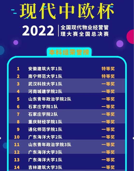 本网讯 11月5日,2022年“现代中欧杯”全国现代物业经营管理模拟大赛落下帷幕。经管学院朱哲宏、王硕、黄泽贤三名同学组成的团队,在李守荣博士精心指导下,经过激烈角逐,以全国第一名的好成绩荣获本届大赛全国特等奖!