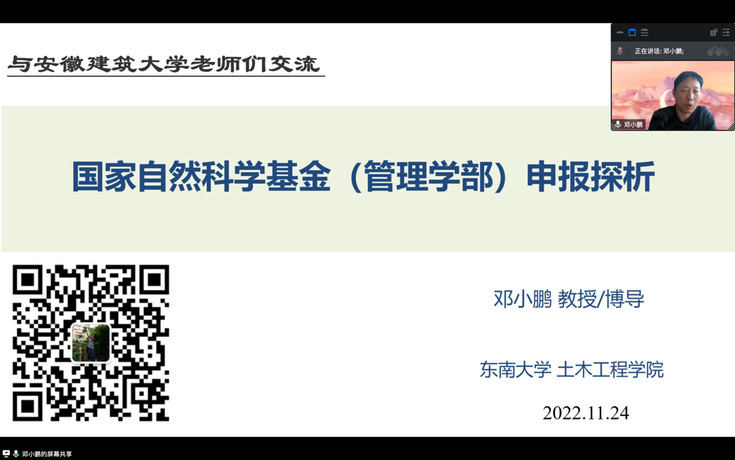 本网讯 11月24日,东南大学博士生导师、经管学院特聘教授邓小鹏应邀为经管学院教师作题为“国家自然科学基金(管理学部)申报探析”的专题辅导,院内外教师共三十余人参加,会议由副院长章蓓蓓主持。