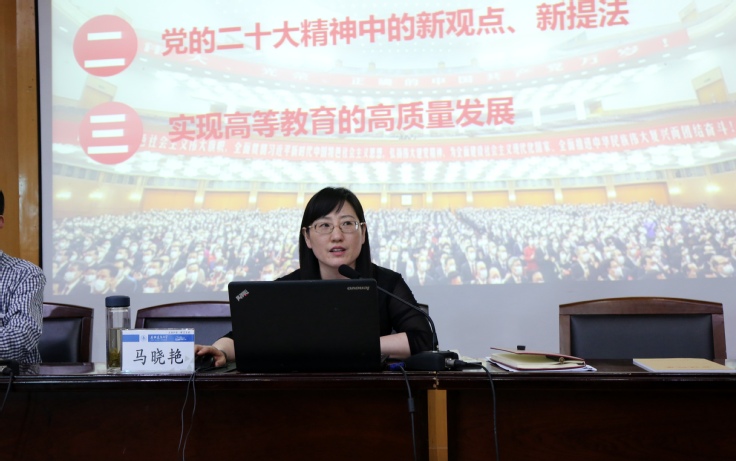 马晓艳从深刻领会党的二十大重大意义、准确把握党的二十大精神实质,党的二十大精神中的新观点、新提法,实现高等教育的高质量发展等三个方面进行深入浅出、理论联系实际的分析讲解,指出习近平总书记所作的二十大报告呈现了高屋建瓴的高度、视野宏阔的深度、博大精深的深度和振奋人心的力度,是全面推进中华民族伟大复兴的政治宣言和行动纲领。百年的量变形成了新时代十年的质变,中华民族伟大复兴凝聚着每一代人的奋斗和努力。