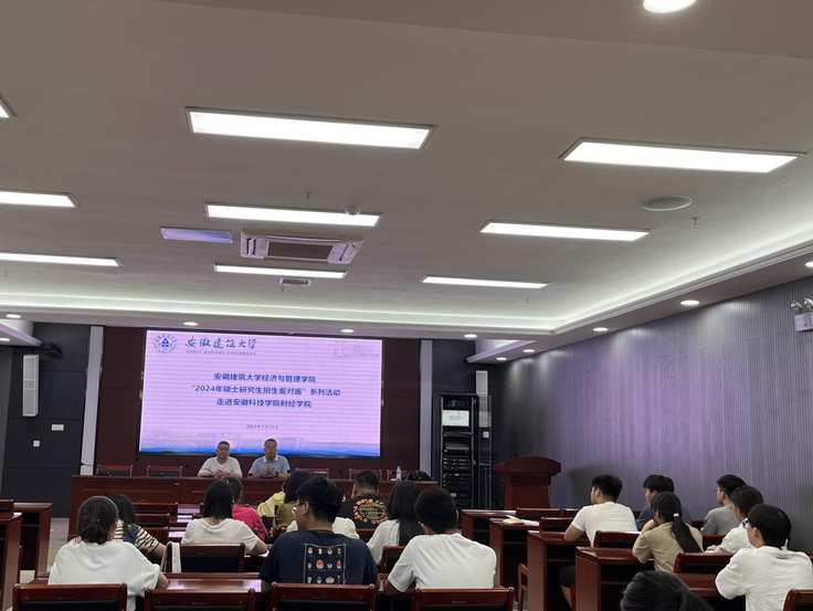 本网讯 为进一步拓展硕士研究生生源渠道,7月12日,经管学院研究生办负责人康玮与学院骨干教师徐洁、唐静一行三人前往安徽科技学院财经学院进行2024年硕士研究生招生宣传。安徽科技学院财经学院党委副书记、纪委书记耿广汉对我院招生团队表示欢迎,并组织学院暑期留校复习备考的学生50余人参加此次宣讲会。