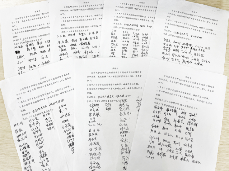 为提高同学们防诈骗意识与能力,加强自我安全保护意识,再次唤醒同学们对生活中各种安全问题的重视,经管学院各班级组织全体同学签署反诈承诺书,同时组织全员安装国家反诈APP,进一步筑牢防范电信诈骗的安全“防火墙”。