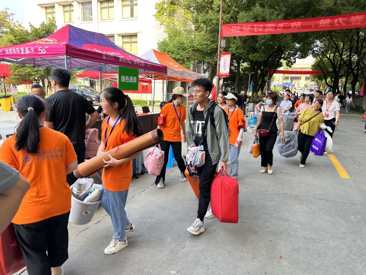 迎新现场,党员们以积极饱满的精神状态迎接来自全国各地的新生,一句句亲切而又温馨的话语让迎新现场显得格外暖心和舒心。他们在校门口、迎新服务点、行李暂存处等站点各司其职,协助23级新生报名登记、搬运行李、办理宿舍入住等。