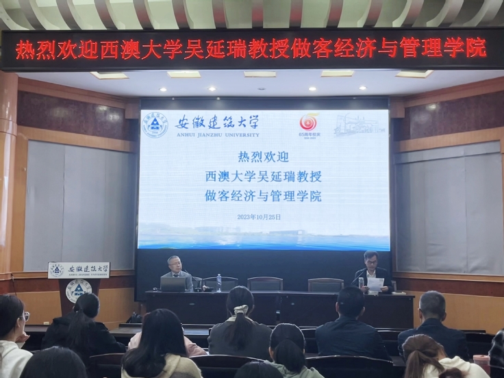 本网讯 为进一步拓展研究生国际化视野,提高学术研究能力,10月25日,西澳大学商学院终身教授、博士生导师吴延瑞教授应邀到经管学院以“电子商务与环境污染:资源消费和能源效率视角的分析”为题举办学术讲座。讲座由经管学院院长彭志胜主持,学院教师、硕士研究生共100余人参加。