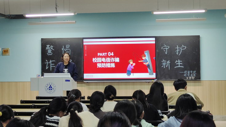 本网讯 为增强研一新生对网络安全和诈骗犯罪的防范意识,提升自我保护能力,近日,经管学院在F514教室开展“警惕诈骗,守护新生”防诈骗主题讲座活动。活动邀请胡萍老师进行主题分享,23级全体研究生参加。