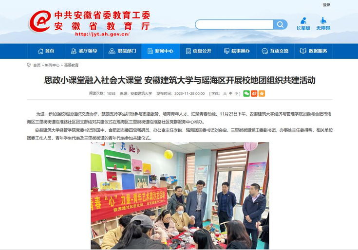 围绕雷锋月开展“知、信、行”系列主题活动,切实提高学生的创新意识和实践能力,鼓励学生将劳动实践能力内化为核心素养;开展劳模进校园、身边的榜样展等活动,进一步营造学习先进、崇尚劳动的良好氛围;组建“‘经心助梦’综合服务实践团”“‘下乡兴梦’菁琯创新创业实践团”分别前往六安市舒城县和芜湖市繁昌区开展捐赠物资、自建房问卷调查,调研乡村特色产业基地,开设“党的二十大精神”思政小课堂等社会实践活动,实践团获评2023年安徽省“三下乡”社会实践活动优秀实践团队;学院团委与合肥市瑶海区结对共建菁琯青年“第二课堂教育实践示范基地”,将思政小课堂融入社会大课堂,以上工作分别在安徽工人日报和安徽省教育厅官网宣传报道,形成良好的示范效应,充分诠释大学生积极参与社会实践的责任与担当。