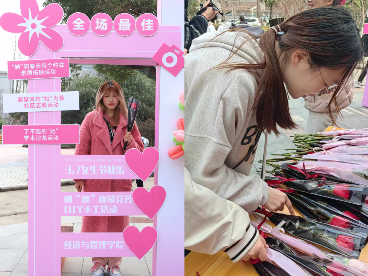 活动现场,“送她一朵小红花”“手绘自画像”“拍照打卡”三个活动吸引众多女生踊跃参与,现场热闹非凡。
