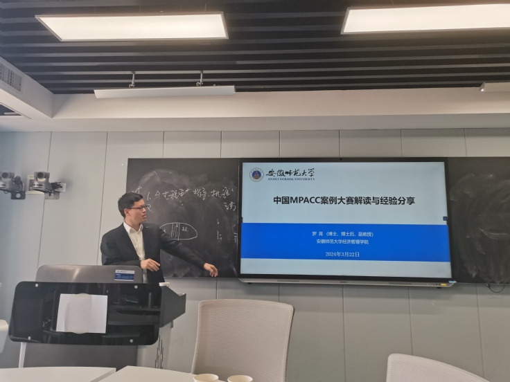 本网讯 为加强会计专业学位研究生培养,提升育人质量,3月22日下午,经管学院邀请安徽师范大学经济管理学院案例中心主任罗昆副教授做题为“MPAcc案例大赛解读与经验分享”的专题讲座。学院会计学科负责人、硕士生导师、骨干教师及会计专业学位研究生等近40人参加。讲座由院长彭志胜主持。
