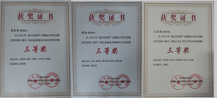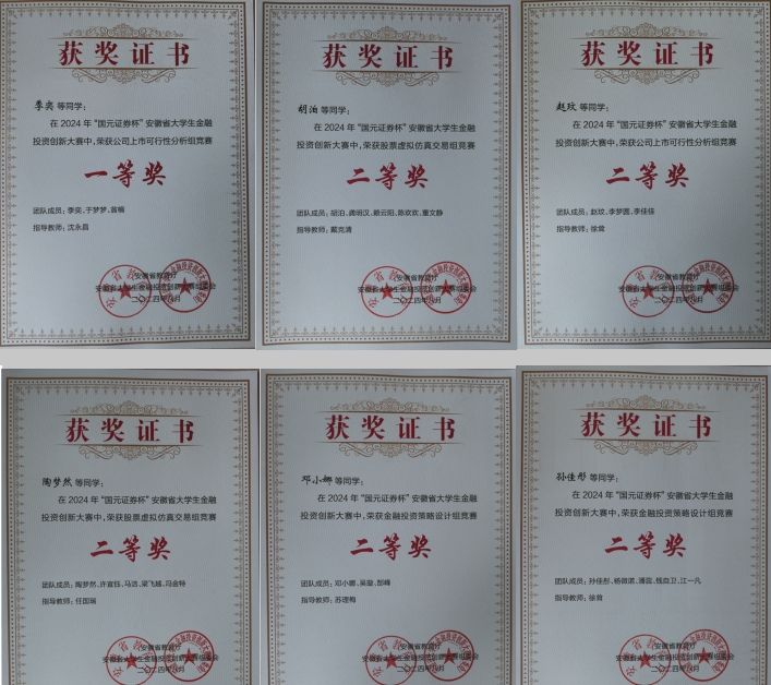 本网讯 近日,由安徽省教育厅主办、安徽财经大学承办的2024年安徽省大学生金融投资创新大赛落下帷幕。经管学子与来自安徽财经大学、安徽大学、合肥工业大学、安徽师范大学等省内高校的一千多个团队同台竞争,经过激烈角逐,季奕作为队长组建的团队获得省一等奖,湖泊、赵玟、陶梦然、邓小娜、孙佳彤作为队长组建的团队获得省二等奖,吴辰雨、湖泊、沈宗航作为队长组建的团队获得省三等奖。