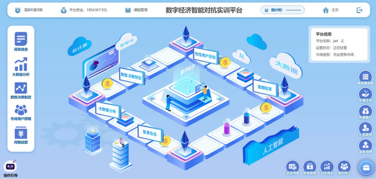 大赛采用“数字经济智能对抗实训平台”进行分组对抗竞赛,以互联网云端监管形式进行。参赛选手要以平台经济为核心切入点,依靠市场数据驱动,从数字技术、数智决策、数字安全等角度出发,模拟平台公司从完全市场竞争到寡头垄断竞争的经营历程。