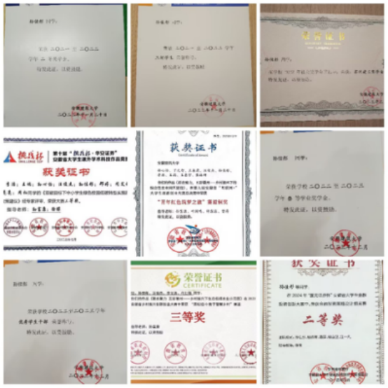 作为一名学生,孙佳彤积极投身于大学生创新创业比赛之中。她大胆创新、勇于突破自我,努力提高自身的综合能力。在各类赛事中,她表现出色,荣获了第九届安徽省“互联网+”大学生创新创业大赛铜奖、第十届安徽省“挑战杯”铜奖、第二届安徽省乡村振兴创新创业大赛三等奖、第十四届电子商务三创赛校级二等奖、安徽省金融投资创新大赛省级二等奖。她还主持了大学生创新创业训练计划省级项目。同时,她参与老师的科研项目三项,负责收集资料,分析数据,将书本知识应用到实践当中,增强自身的创新能力。