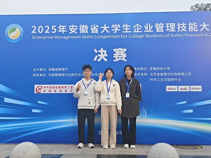本网讯 11月2日,由安徽省教育厅主办,安徽财经大学承办的安徽省大学生企业管理技能大赛经过两天的角逐,在蚌埠圆满落幕。由我院大一新生魏璨、叶灿和王婷婷三位同学组成的代表队,与来自合肥工业大学、安徽大学、安徽农业大学、安徽理科大学、安徽医科大学和安徽财经大学等35所本科院校的135支代表队同台竞技,在比赛中脱颖而出,获得三等奖。