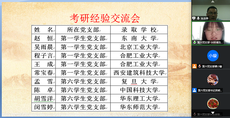 9名考取研究生的党员在线上作考研经验分享,他们结合自己的亲身经历分享了考研经验,就考研时间安排、复习的方法、考研资料的准备、辅导班的选择、技巧及经验作了交流。回答了同学们提出的相关问题,并希望学弟学妹们在考研路上要做到坚定信心,坚持不懈,务实求真。