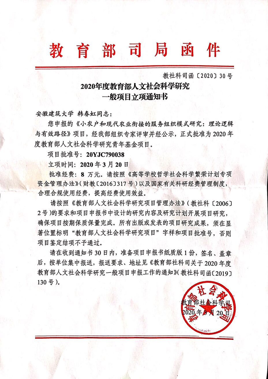 | 20YJC790038 | 小农户和现代农业衔接的服务组织模式研究:理论逻辑与有效路径 | 韩春虹 | 8 |