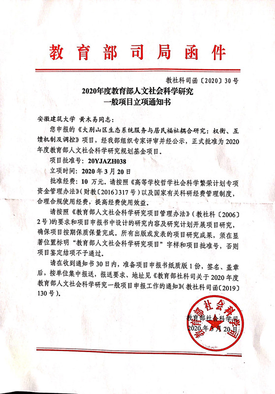 4 | 规划基金项目 | 20YJAZH038 | 大别山区生态系统服务与居民福祉耦合研究:权衡、互馈机制及调控 | 黄木易 | 10 |