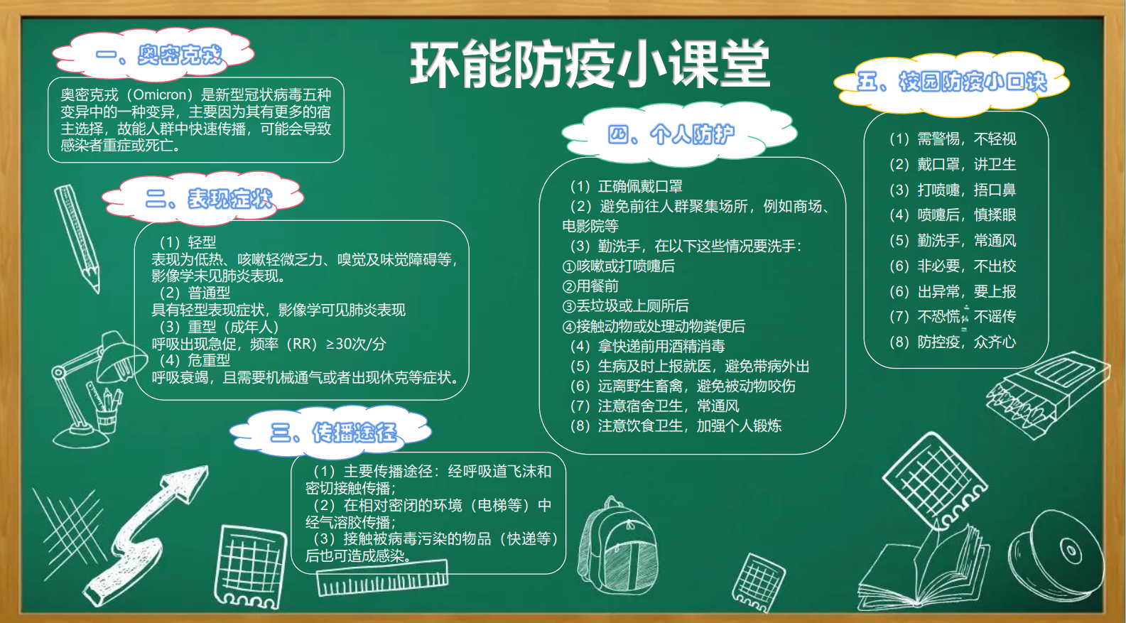 防疫知识“挂”起来。为了把疫情防控知识说得通俗易懂,让宣传内容入脑入心,环能学院研究生党支部将“环能防疫小课堂”等疫情防控知识、政策编写成活泼生动、通俗易懂的防疫宣传小知识,张贴在各个宿舍,时刻提醒广大研究生重视疫情,并真正将疫情防控政策等内容不间断地传递到宿舍里、耳里、心里,形成全校防疫的强大合力。