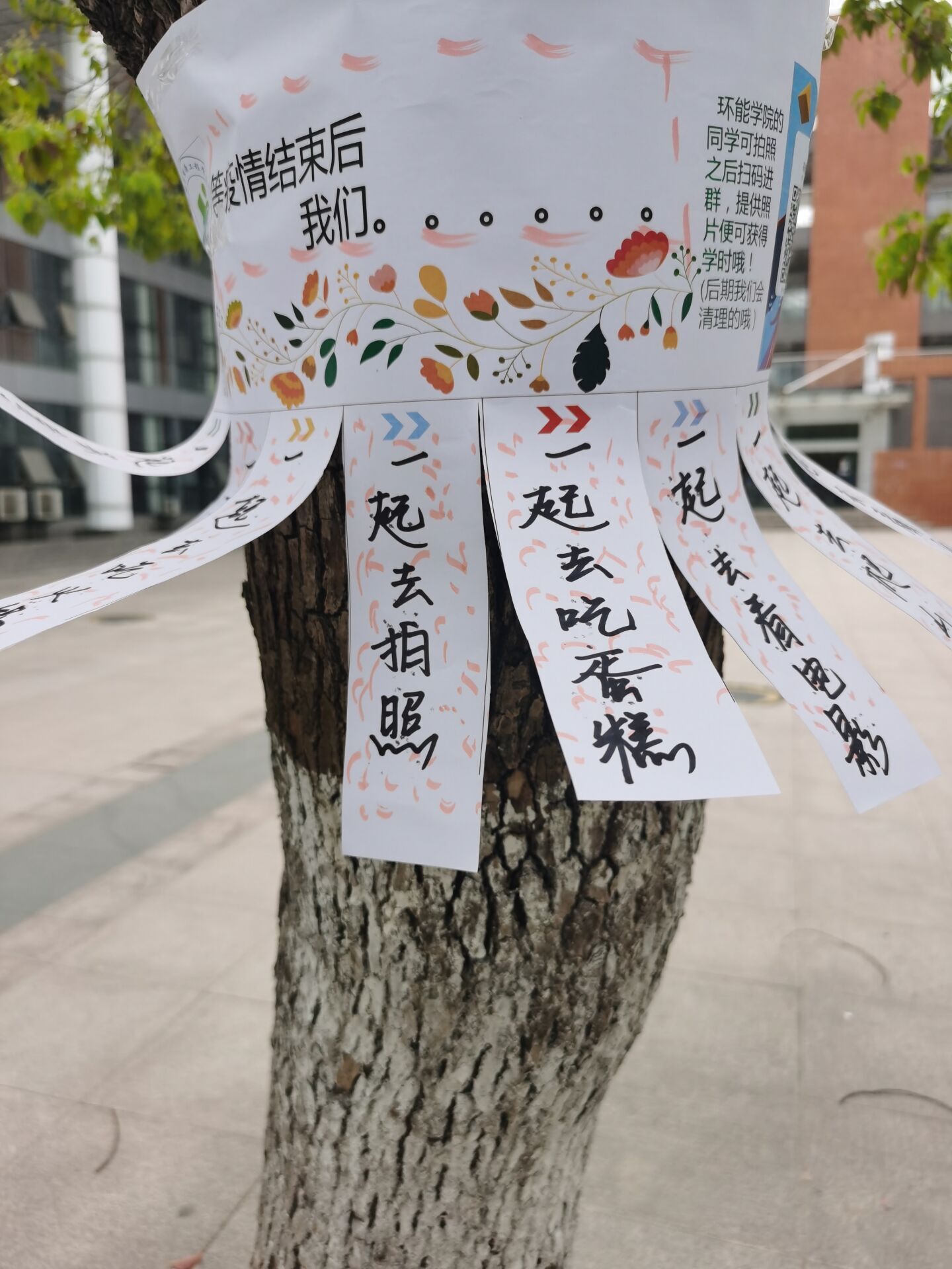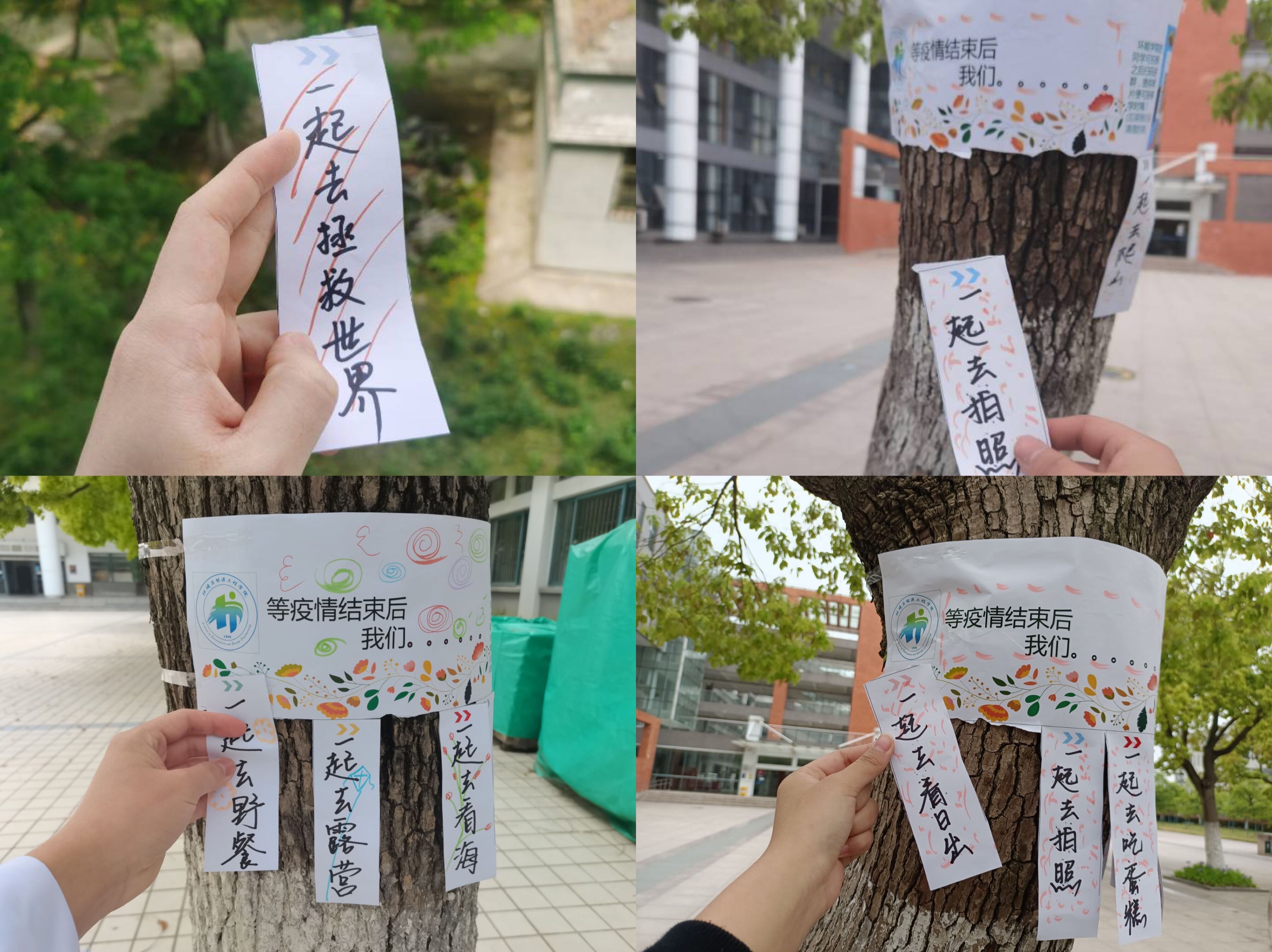本次活动主题为“等疫情结束,我们一起…… 现在我要……”。同学们精心制作了彩签,并将其粘贴在校园醒目的位置,路过的行人均可撕下自己心仪的心愿条或是写下自己的小小心愿表达美好希冀。“等疫情结束后,我们一起去吃大餐!现在,我要吃遍食堂的每一个窗口!”,“等疫情结束后,我们见一面吧!现在我要多去图书馆看看书”,“等疫情结束后,我们一起爬黄山!现在我要为室友唱一首歌”,“等疫情结束,我们一起去读研,现在我要去食堂做志愿者了”,“等疫情结束我就要毕业了,现在我要拍遍校园的每一个角落,留下最美好的青春回忆”……同学们畅想美好未来又不忘努力当下,充分显示了在抗疫的关键时刻,同学们都能从大局出发,选择服从统一安排听从统一指挥,齐心协力,共同抗疫。