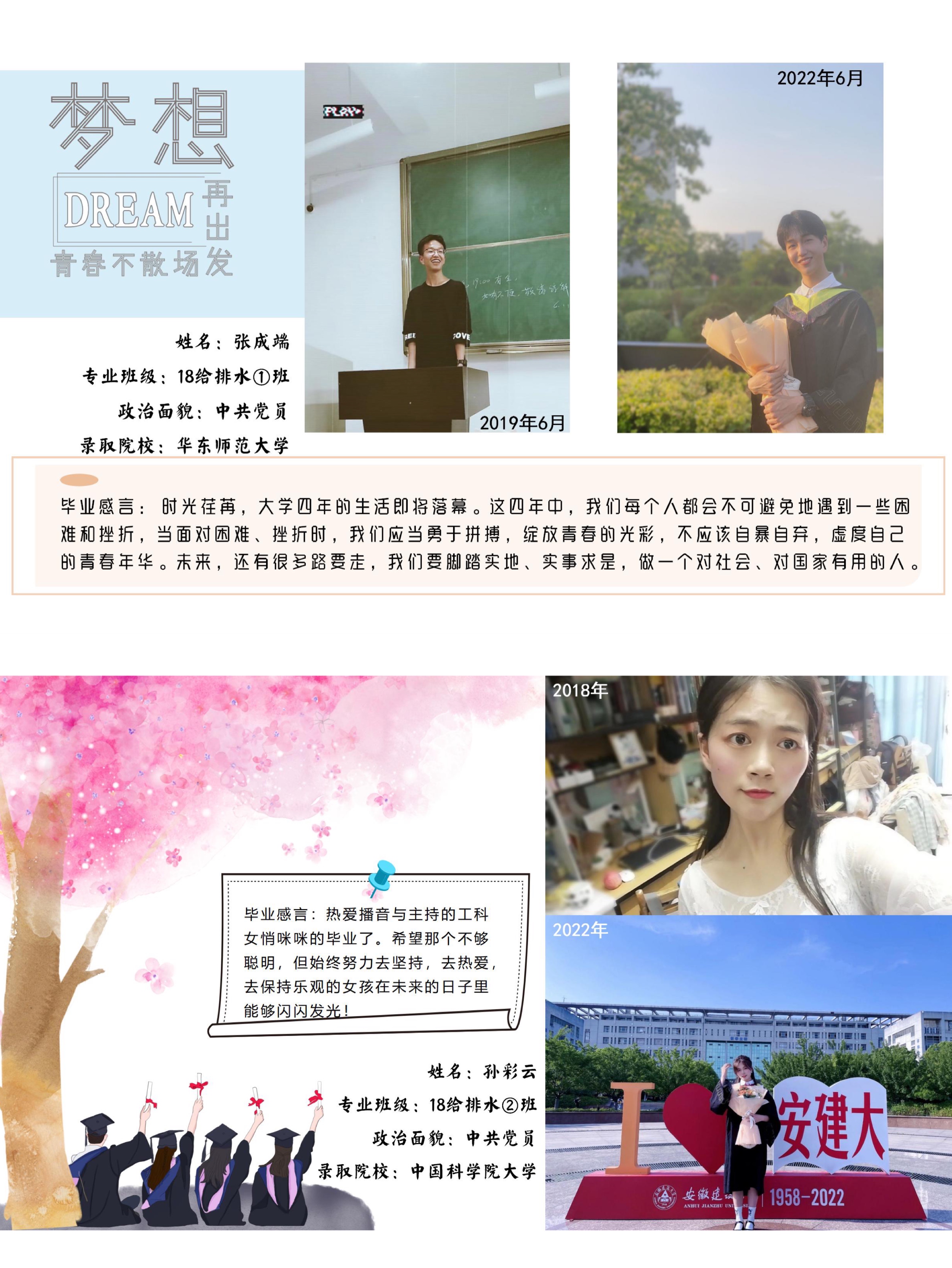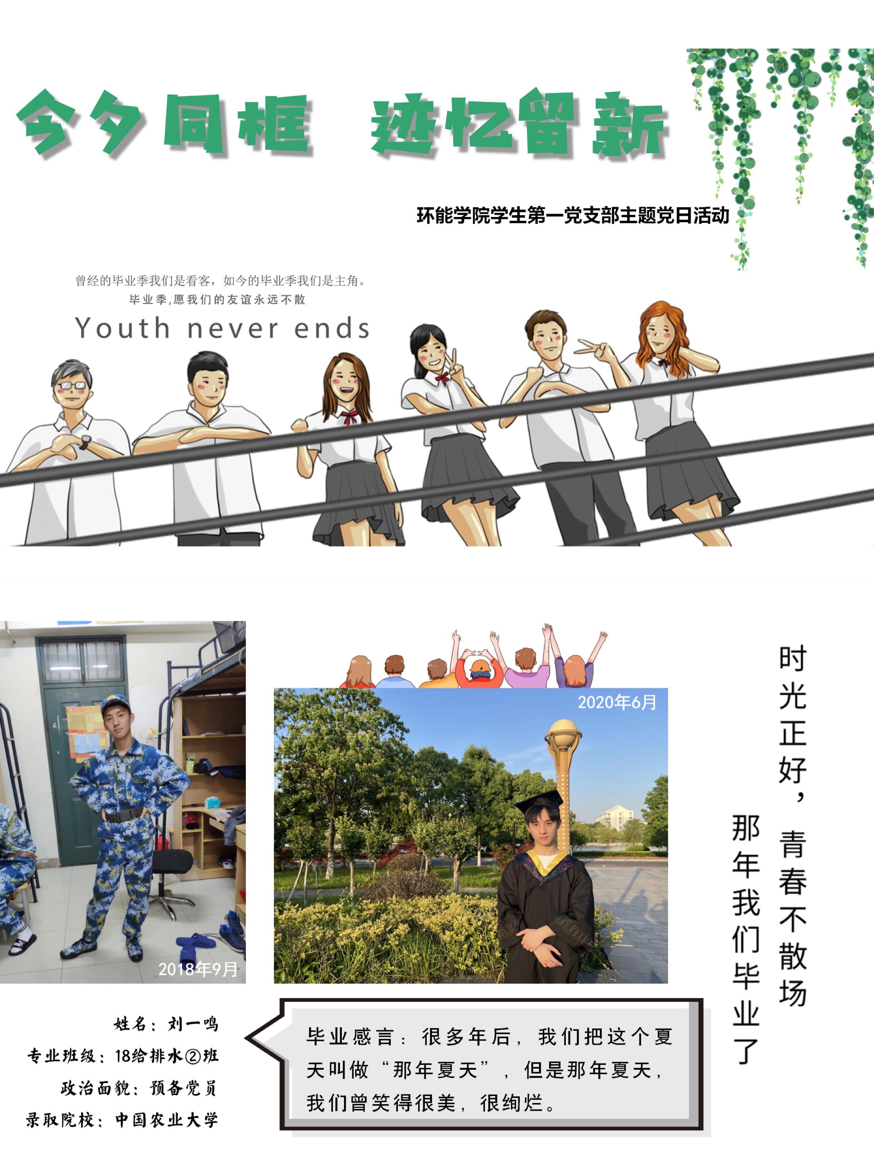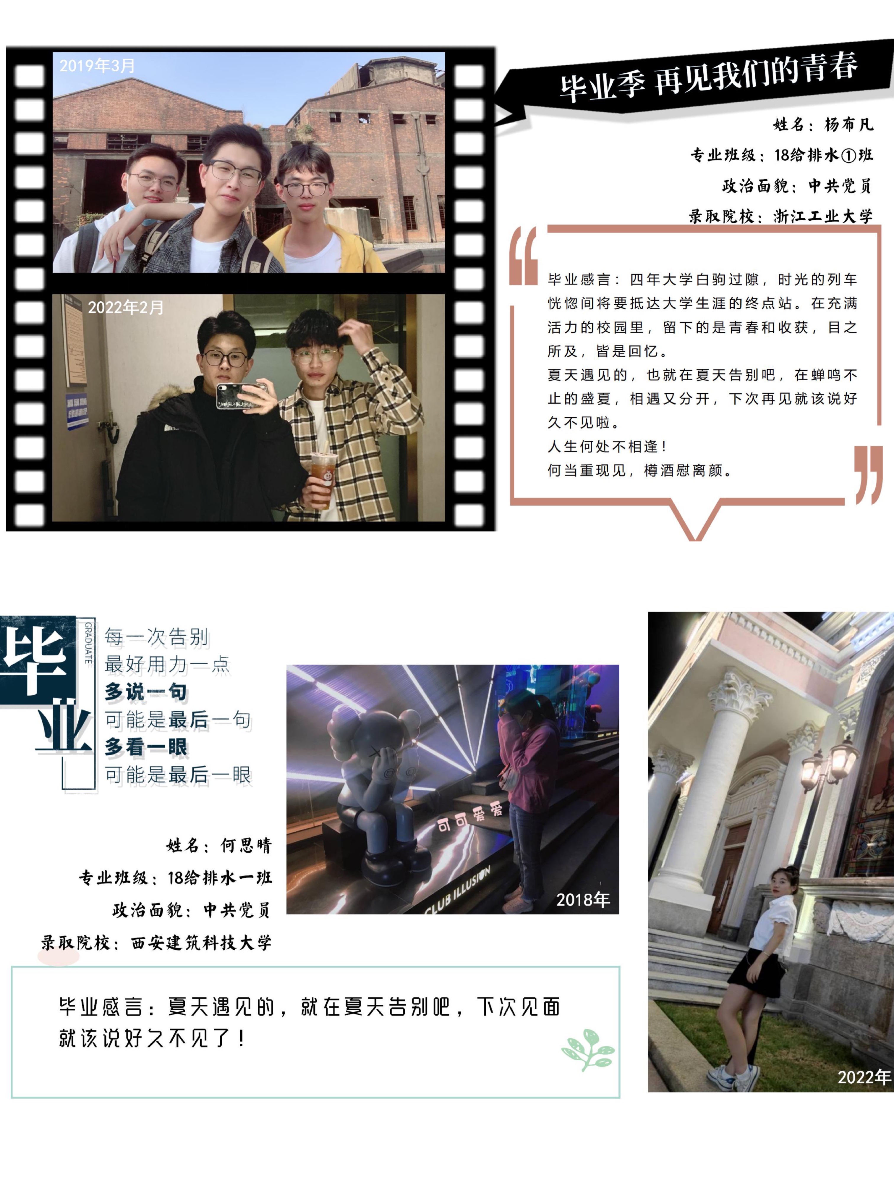 为丰富、充实毕业生校园文化生活,营造温馨和谐的毕业季氛围,近日,环能学院学生党支部举办了“今夕同框 迹忆留新”主题党日活动,毕业班党员翻开手机相册,寻找四年前的自己。四年前懵懂无知,四年后自信昂扬,从照片的今昔对比中,清晰的看到时光在每个人身上留下的痕迹,毕业感言上写满了真挚的文字,或回忆自己大学生活的千滋百味,或由自身经历告诫学弟学妹们切莫虚度宝贵的大学光阴,又或抒发对母校的留恋与祝福、对师友的不舍与希冀。毕业生们写下的每一个字、每一句话都包含着他们对母校的感恩眷恋,同时也透露着在未来的奋发向上豪情斗志。