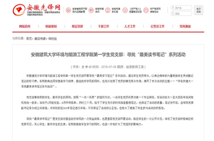 学院党委积极开展形式多样的主题党日活动,持续发挥党建活动品牌效应。教师党支部定期开展教学观摩、课程思政沙龙、项目申报等交流活动,学生党支部开展爱国教育、学习经验交流、乡村振兴暑期社会实践等活动。安徽先锋网专题报道学生第一党支部开展的“寻找最美读书笔记”活动,目前该活动已经在全校推广。