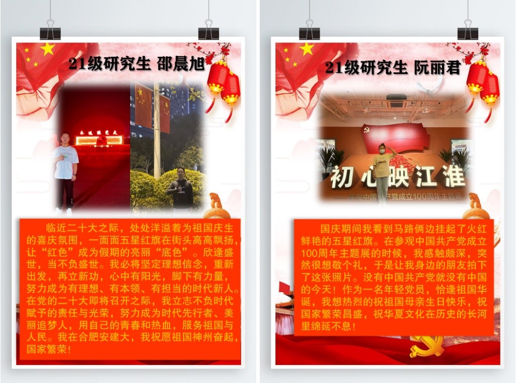 通过本次主题征集活动,环能学院研究生党员们感受颇深,纷纷表示要积极努力,认真学习进一步坚定自己的初心和理想。在新时代为建设更加繁荣美的祖国贡献一份青春力量,为新时代全面建设社会主义现代化国家而不懈奋斗,与祖国同行,用青春梦想,实际行动,为中华民族的伟大复兴作出应有的贡献,成为一名真正爱党爱国爱校的新时代党员!(文/图靳杰 陈悠 曾健平;审稿:戴前宏