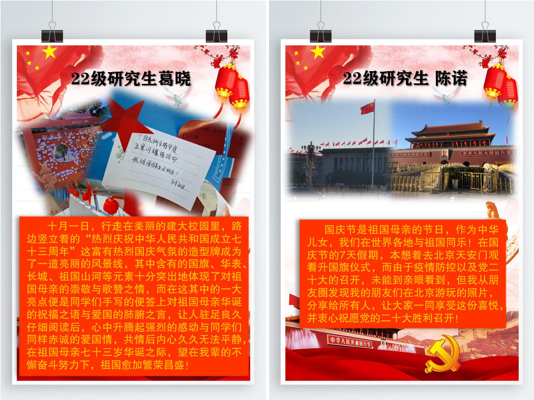 本网讯  十月鲜花吐芬芳,华夏儿女齐开颜,一声祝福献祖国,繁荣富强万世昌!迎接党的二十大胜利召开,进一步激发研究生党员的爱国之情、报国之志、强国之责,环能学院研究生党支部全体党员通过自己真挚的话语表达着自己对党和国家的美好祝愿。