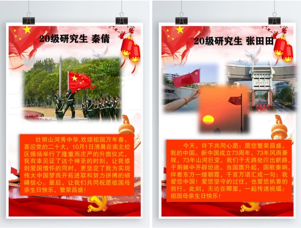 环能学院研究生党支部全体研究生党员积极报名,踊跃参与,他们唯美的图片和动情的文字表达自己对祖国的美好祝福,充分展现了当代研究生们爱党爱国情怀。此次征集,共收集80篇参赛作品,话题参与度高,得到了支部党员充分支持