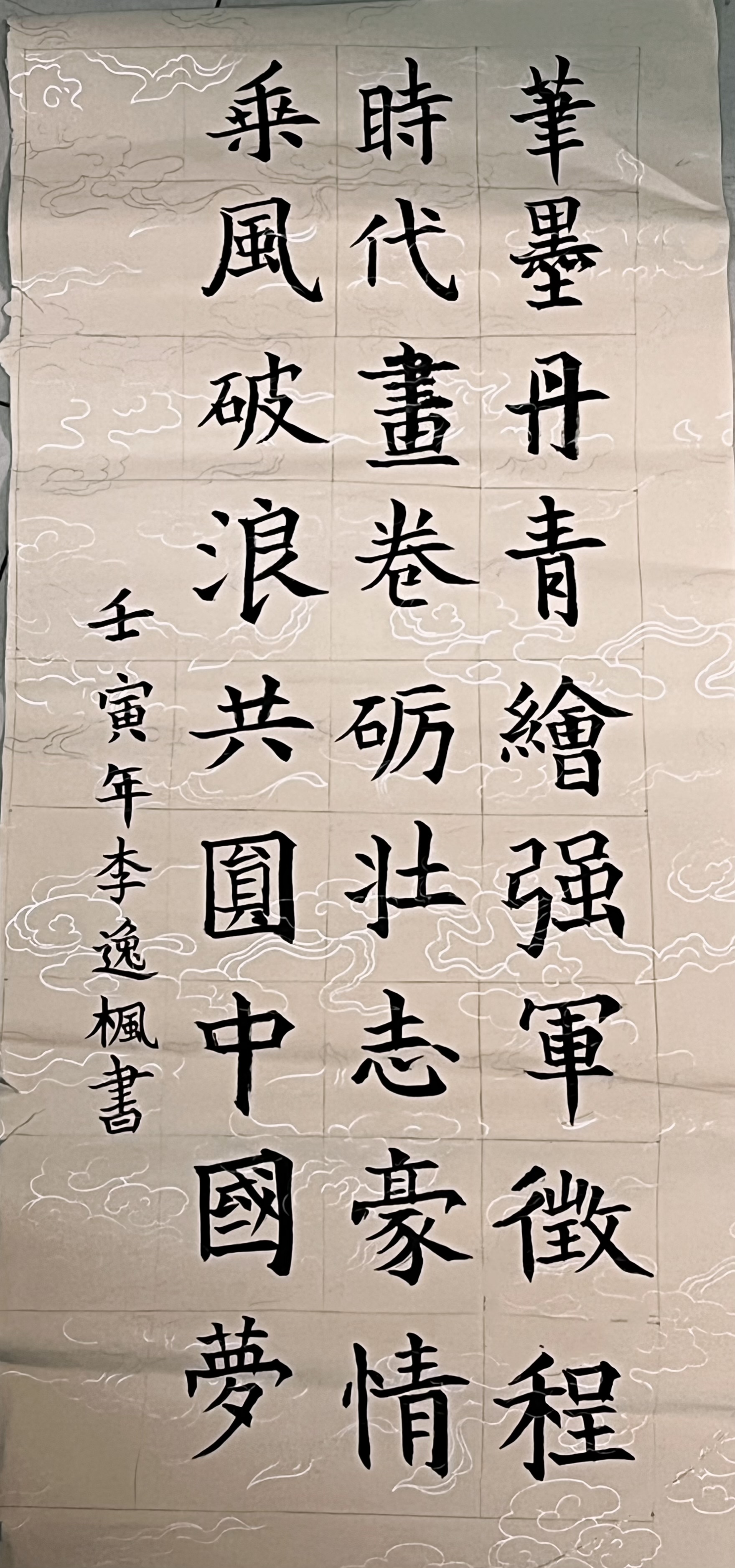 为配合学校疫情防控相关要求,本次比赛全程线上进行。同学们积极参与、潜心创作以书言志,礼赞党的丰功伟绩;以画传情,讴歌伟大新时代。在参与线上评比的14份作品中,和平鸽、祥云等象征着美好意愿的元素跃然纸上,中国版图、人民英雄纪念碑等红色元素层出不穷最终,22级给排水专业的陈芷妍同学的作品绮丽绚烂,获得了环能学子一致好评,在线上投票中夺得桂冠。