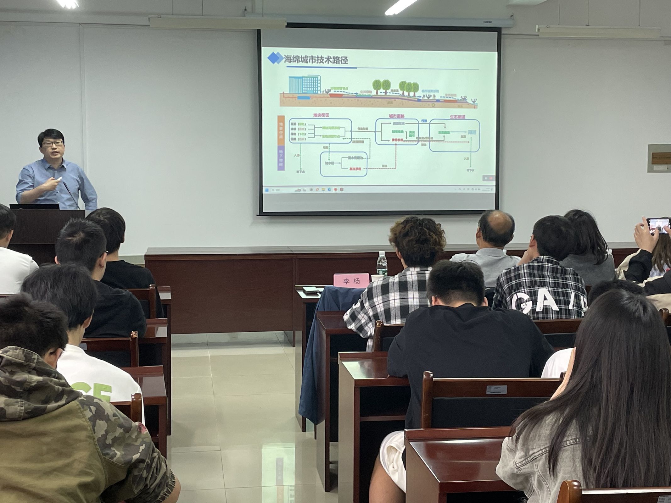 中国城市科学研究会雨洪管理与海绵城市专委会委员、高级工程师李杨就海绵城市定义、标准以及海绵城市下专业就业方向等几个方面深入浅出分享“海绵城市” 专业知识。他表示,“海绵城市”是响应习近平总书记生态保护思想的重要实践,当前行业发展迅速,专业技术人才需求大,希望大家强化专业知识,认真研究行业发展的热点问题,积极投身“海绵城市”建设中。高级工程师陈凌宇从海绵城市设施的应用为导入,详细讲述当前“海绵城市”渗排一体化海绵技术的详细步骤和实践案例,他勉励同学们发挥自身优势,学好专业知识,将书本上的知识与实践融会贯通,在实践中不断增长智慧才干,在艰苦奋斗中锤炼意志品质。