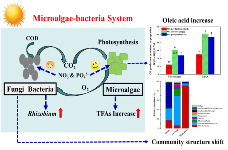 相关成果以“Pollutants removal, microbial community shift and oleic acid production in symbiotic microalgae–bacteria system”为题发表在中科院一区Top期刊Bioresource Technology(IF11.4)上。(文:胡昊;审核:谢发之)