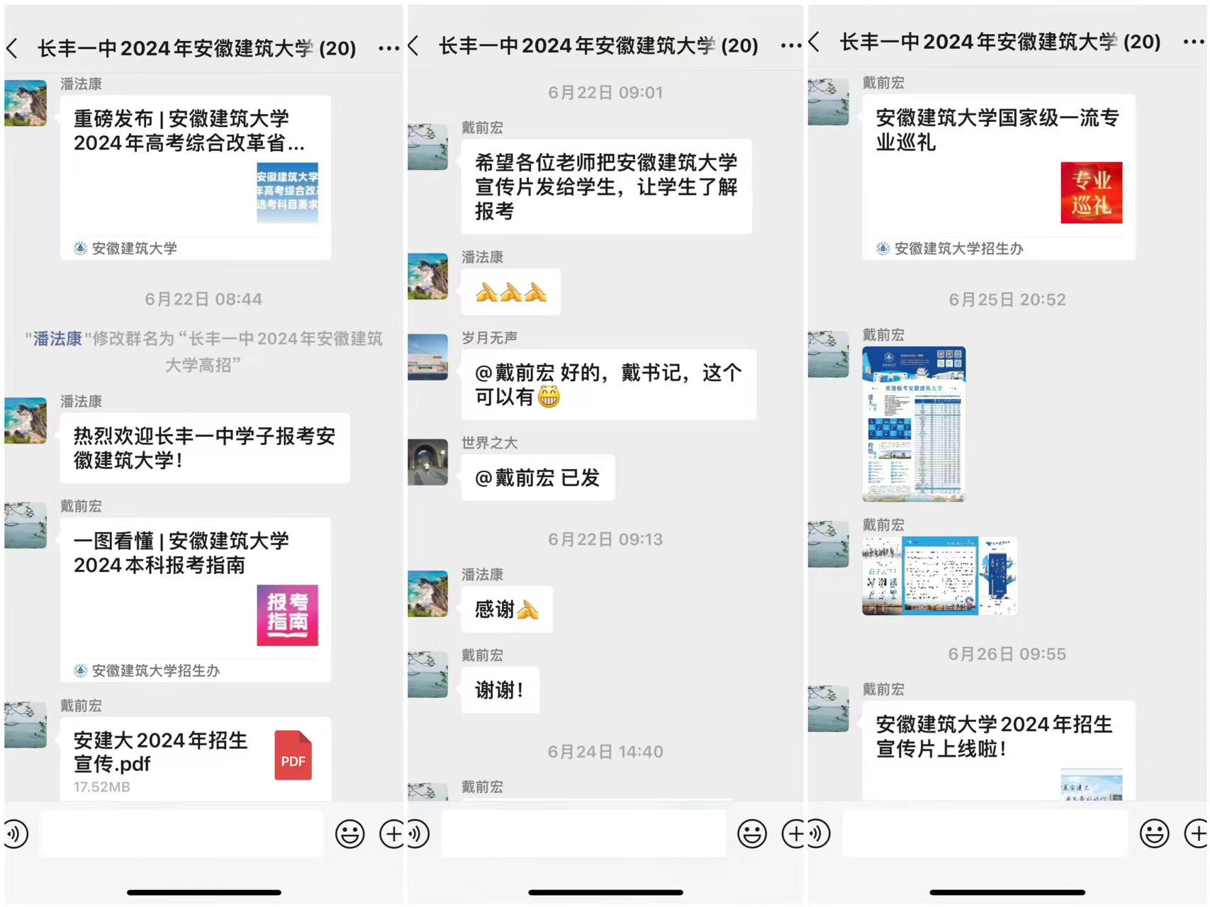 与生源高中加强联系,实施走出去的招生宣传方法,是扩大学校影响、同时精准服务地方的有效举措。6月4日高考前夕,学院领导率队赴长丰一中与全体高三毕业班班主任开展了深入交流,并与班主任建立微信群,及时与各位班主任沟通交流,全面推广学校。未来,学院计划持续加强与各中学间的沟通,以优质生源基地建设为抓手,通过搭建高校与高中的联合平台,以大学教师走进高中课堂的形式与高中生进行全面交流,为招生宣传工作的开展创造良好条件,为学校做好生源提质升档工作贡献力量。
