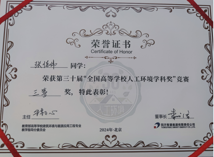 本网讯2024年8月22日,第30届“全国高等学校人工环境学科奖”专业基础竞赛(简称“人环奖”)颁奖典礼在清华同方科技广场举行。我校环境与能源工程学院建筑环境与能源应用工程专业2021级学生张佳伟荣获全国三等奖。