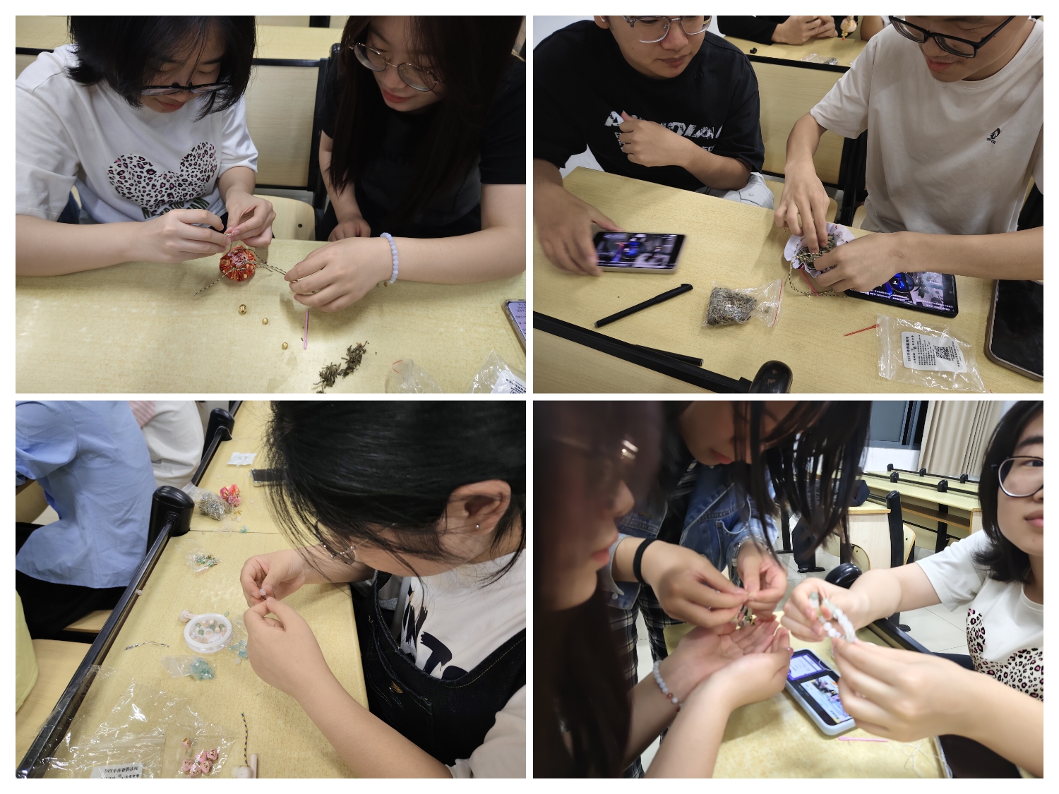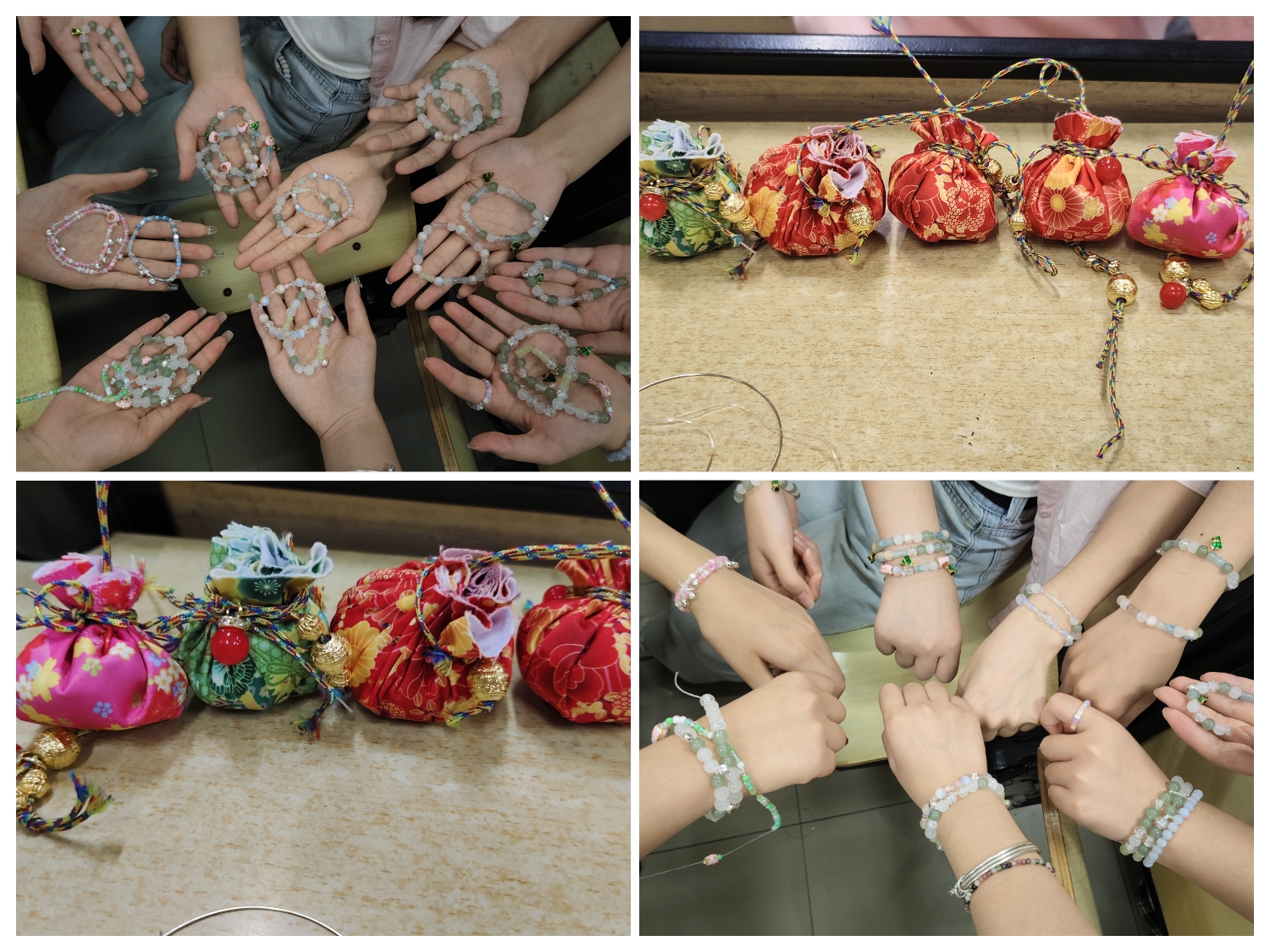 活动伊始,主持人向同学们介绍了端午节的悠久历史与丰富的传统习俗,重点讲解了香囊制作的文化内涵及其工艺技巧。随后,同学们自由组队,在领取彩线、布料、香料等材料后,积极投入到手作创作中。活动现场气氛热烈而融洽,有的同学专注缝制香囊外袋,有的精心编织五彩手绳,还有的巧妙搭配珠串进行装饰。大家通过分工协作,共同完成了一件件富有创意与匠心的作品。同学们纷纷表示:“这次活动不仅锻炼了我们的动手能力,更让我们在亲身体验中深刻感受到传统文化的独特魅力。每一针一线都凝聚着我们对中华文化的敬意。”