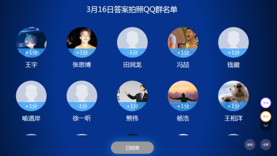 3、在课中互动环节要求学生必须完成相应练习,采用学习通的选人功能随机选择若干学生上传到QQ群,督促学生快速完成课中任务,对于无应答的“伪上课”学生扣除课堂积分。