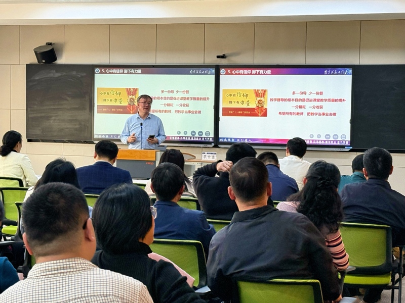 本次培训共分两个阶段。第一阶段,裴世鑫教授以“以督促教 以导促改 督导结合 重在质量”为主题,围绕南信大督导聘任流程与工作开展、督导工作内容与听课评课、督导专项工作开展与案例分享、督导工作反思与心得体会等方面,开展专题辅导讲座。他通过对南京信息工程大学教学督导工作的介绍,提出教学督导工作的核心理念,结合具体案例详细解析了教学督导评价的多元维度与实施路径,从“督”与“导”两方面出发,强调教学督导工作需兼顾教学规范性与创新性,通过科学的评价体系助力教师提升教学水平。裴世鑫教授提出“打铁还需自身硬”,强调教学督导人员需不断提升专业素养,着力形成“督促—引导—改进”的良性循环,最终实现本科教学质量的全方位提升。培训会结束后,裴世鑫教授与参会人员进行亲切交流,与会教师纷纷表示讲座内容丰富、案例详实、见解深刻,让他们对本科教学督导工作有了更深入的理解和认识,为今后更好地开展教学督导工作提供了有益的借鉴。