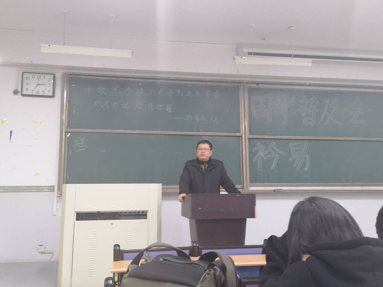 本次国学知识普及大会邀请了社团指导老师炜主讲,主要介绍了国学的主体组成部分——四书五经及国学在整个中华发展史上的地位,强调了国学是以先秦经典及诸子百家学说为根基,涵盖各朝各代的各类文化学术。此外,还向学生们简述了诸子百家和历朝历代中重要的典籍及其他一些国学常识,让当代大学生能够对中国的传统文化学术产生一定的兴趣并且能够以弘扬国学文化、传播国学知识为己任,做一个“学国学、思先贤、树正气、扬美德”的当代好青年。同时,同学们也积极热情的与谢老师互动,不仅学习到了丰富的国学知识,也增进了同学与老师之间的情感。