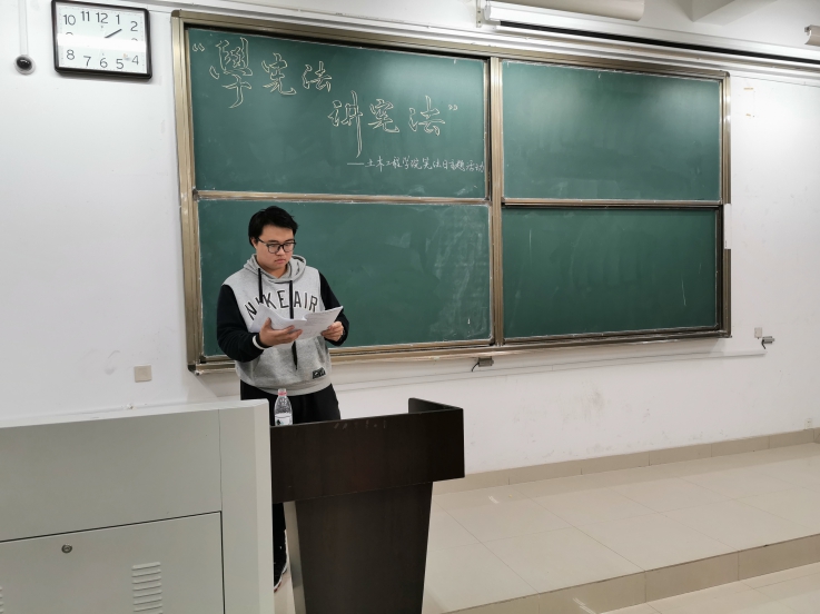 活动分为两个部分,首先进行的是以“讲宪法故事,说心得体会”为主题的宪法普及环节,在武宜成、喻道岸同学的讲述下,参加活动的同学们一起学习了宪法知识,也认识到了宪法学习的重要性和宪法宣传的必要性。紧接着的是以宪法为考核内容的知识小问答环节,大家积极投入活动,踊跃举手抢答,在现场掀起一波新的高潮。“治国凭圭臬,安邦靠准绳。”宪法的实施,不仅在于国家,还在于人民。通过本次活动,同学们更加了解宪法,更加愿意遵守宪法,自觉成为宪法的忠实崇尚者,自觉遵守者,坚定捍卫者。(图/文:王月竹 杨逸凡;审稿:胡燕青) |