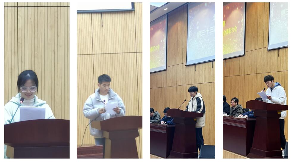 运动员代表21土木一班蔡俊仁、22道桥二班蒋昊、优秀班级代表21安全二班赵倩、学生会代表21测绘张凌志相继上台发言。他们分享了在运动会中的心得体会,表达了对学院的感谢,并表示会在以后的运动会中继续努力拼搏,为学院增光添彩。