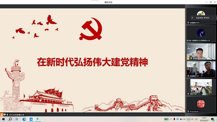 【主题教育】本网讯 为庆祝中国共产党成立102周年,扎实推进主题教育走深走实,6月27日下午,安徽省BIM工程中心党支部、土木学院建工系教工党支部联合南京大学博士生讲师团、太湖县刘畈乡党委共同开展线上联合主题党课活动。南京大学博士生讲师团副团长、物理学院研究生物理系二支部党支部书记李竹安,安徽省BIM工程中心党支部书记满大伟,太湖县刘畈乡党委书记方毅共同为三个基层党组织的全体党员上了一堂精彩生动的线上微党课,活动由刘畈乡党委书记方毅主持。