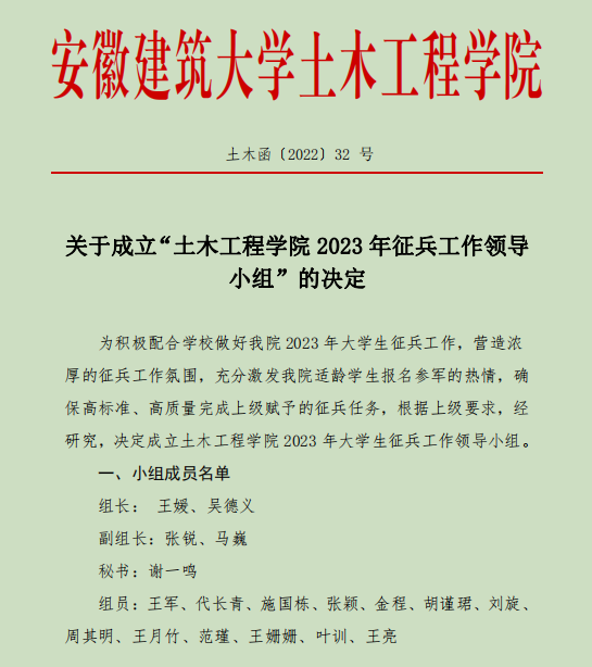 完善顶层设计 建立健全征兵机制 “国无防不立,民无兵不安”。学院高度重视征兵工作,建立健全机制,创新宣传引导,坚持铸魂育人,深化贴心服务,稳步推进征兵工作。2022年底学院成立《2023年度征兵工作领导小组》,制定征兵工作计划,明确工作细则,统筹开展征兵工作。定期组织召开大学生征兵工作会议,总结经验,层层分解征兵任务,压实征兵责任,力求做到早动员、早部署,夯实征兵基础。
